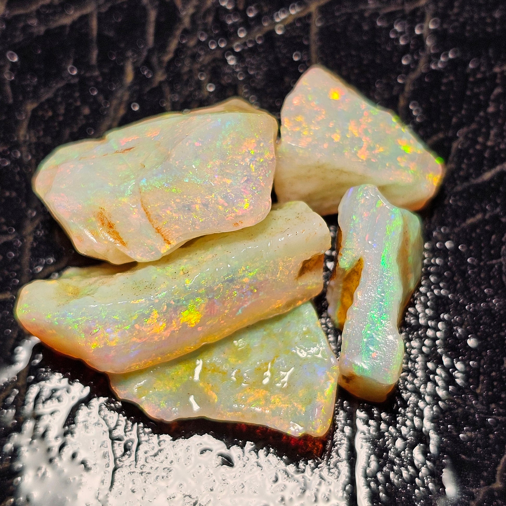 Genuine Australian white based opal mined in Coober Pedy. This parcel has five gem grade stones that show vibrant full spectrum colour with beautiful red flashes.