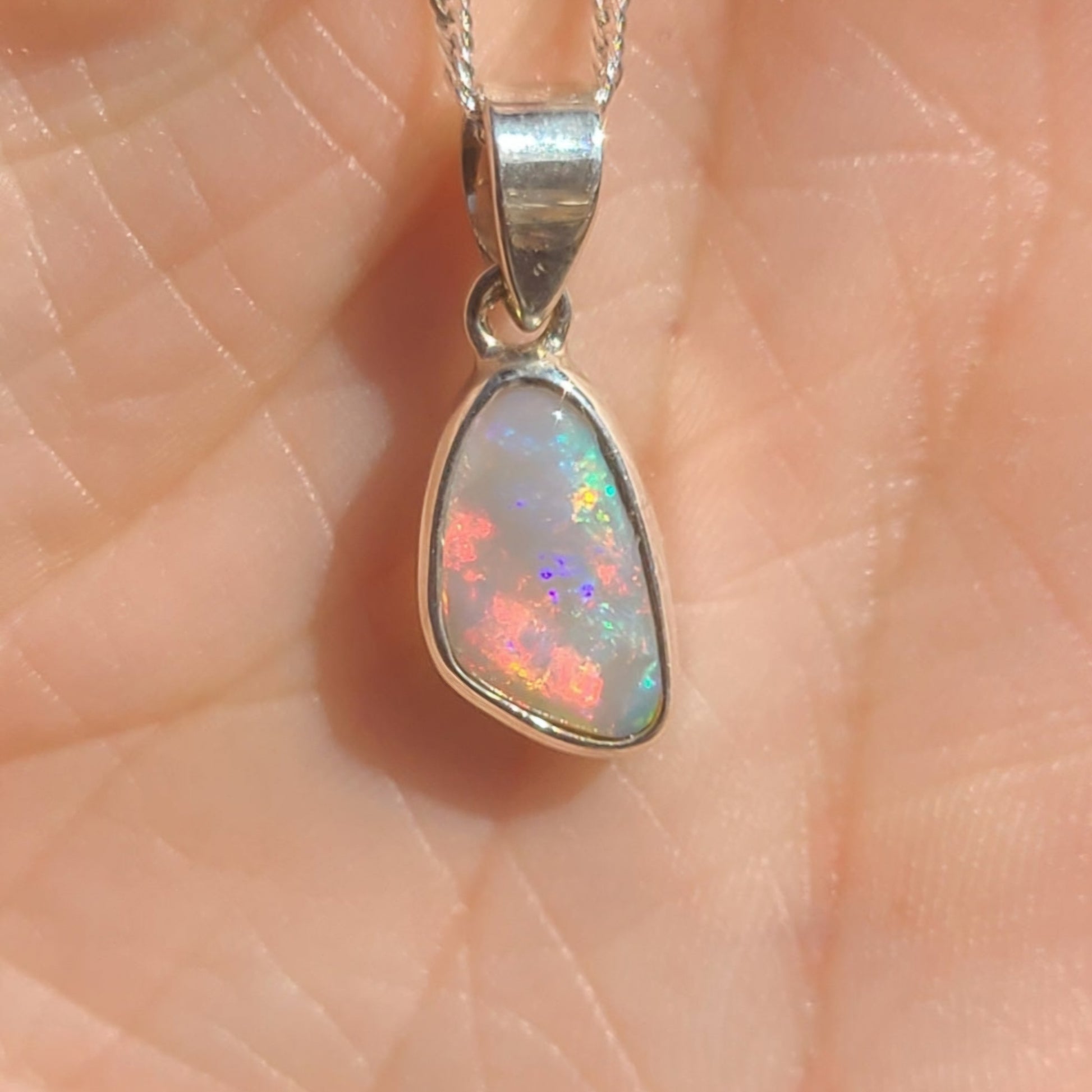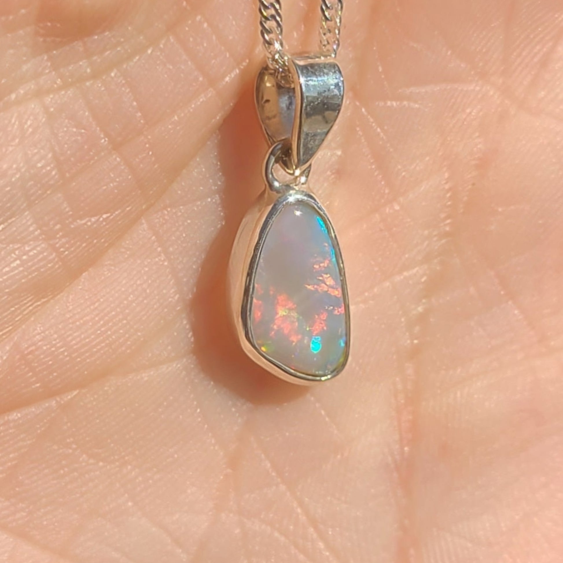 Genuine Australian light opal found in Coober Pedy. Cut to free form shape and set in 925 Sterling Silver.